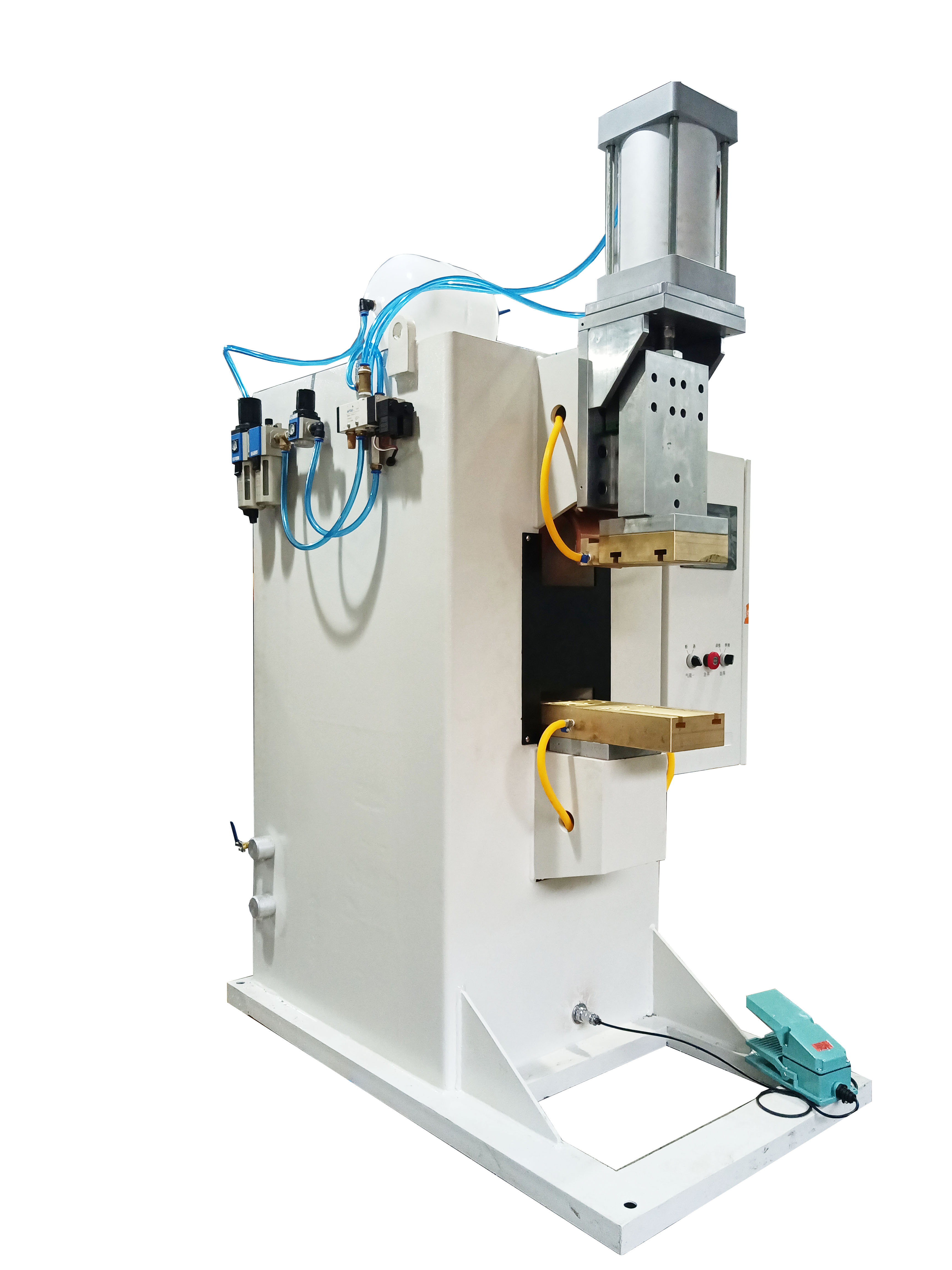 傳動部分采用氣動加壓,能保證足夠的焊接壓力,通過四柱滾珠模架的精確導向確保上下電極的平整度。